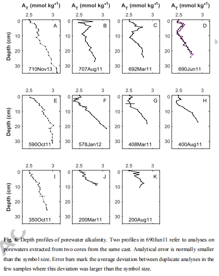 研究意義:定量揭示了碳酸鹽溶解的凈效應(yīng)及其發(fā)生位置。計算表明,在所有研究的巖芯中,最頂部2毫米內(nèi)均有顯著的堿度產(chǎn)生,速率約為0.013 ± 0.009 nmol cm?2 s?1,對應(yīng)的碳酸鹽溶解通量約為~1.2 mmol m?2 d?1。這為“沉積物頂部發(fā)生代謝溶解”提供了最關(guān)鍵的量化證據(jù)。
