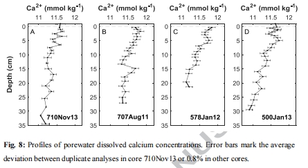 研究意義:揭示了溶解產(chǎn)物的遷移和再沉淀過程。Mn2?在較深水(>500米)站點的孔隙水中大量積累(圖5),并在~3厘米以下深度達到錳錳礦(MnCO?)的過飽和(圖7D),表明發(fā)生了MnCO?或(Ca, Mn)CO?的自生沉淀。堿度剖面在淺部升高后出現(xiàn)降低(圖6),以及Ca2?濃度在深部降低(圖8),均支持了深部沉積物中存在碳酸鹽再沉淀過程,消耗了由淺部溶解產(chǎn)生的溶質(zhì)。