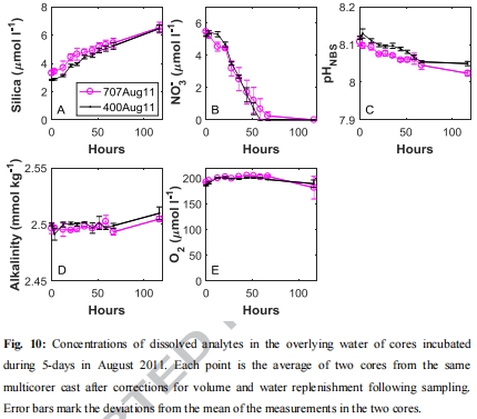 巖芯培養(yǎng)實驗:將沉積物柱狀樣在實驗室恒溫(21°C)黑暗條件下培養(yǎng)數(shù)天,監(jiān)測上覆水中pH、堿度、營養(yǎng)鹽等的變化,以評估沉積物-水界面的凈交換通量(圖10)。