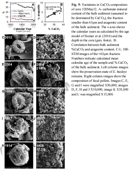 數(shù)據(jù):沉積物CaCO?含量%、文石含量%、顆石藻電鏡照片、可提取錳含量。