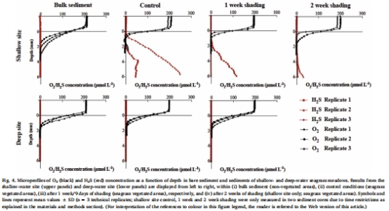研究意義:這是最關(guān)鍵的發(fā)現(xiàn)之一。僅在淺水海草植被區(qū)沉積物中檢測(cè)到顯著的H?S(最高624 μmol L?1),且其出現(xiàn)深度(~2.8 mm)遠(yuǎn)淺于裸沙區(qū)(>6 mm)。遮蔭處理后,淺水區(qū)的H?S水平顯著降低至近乎為零。這強(qiáng)有力地證明,淺水海草通過(guò)光合作用為根際硫酸鹽還原菌提供了有機(jī)基質(zhì)(根滲出物),直接驅(qū)動(dòng)了H?S的產(chǎn)生。遮蔭后光合作用減弱,基質(zhì)供應(yīng)減少,從而抑制了微生物活動(dòng)與H?S生成。深水站點(diǎn)始終未檢測(cè)到H?S,表明其根際微生物活動(dòng)微弱。