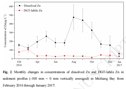 數據:通過HR-Peeper和DGT獲取的月度溶解態Zn和DGT有效態Zn的垂直分布濃度(-100 mm至上覆水)。