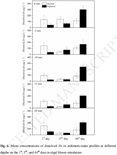 藻華模擬實驗:向沉積物-水系統中添加含銅綠微囊藻的湖水,模擬藻華生長、爆發和降解過程,監測不同時期(第1、15、44天)沉積物孔隙水中Zn、Mn、Fe的濃度晝夜變化(圖5, 圖6),并使用DGT測量有效態Zn(圖7)。