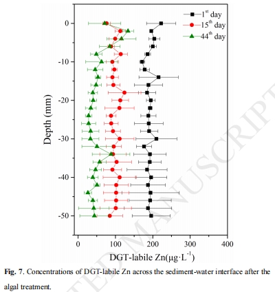 數據:藻華模擬實驗后,DGT測得的有效態Zn垂直分布剖面。