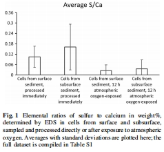 數據:EDS測量的重量百分比比。新鮮細胞S:Ca高(表層0.105,深層0.161);氧氣暴露細胞S:Ca低(表層0.025,深層0.035)。