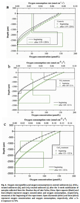 在最表層沉積物(0-1500 μm),生物氧消耗顯著被MNPs抑制,CeO2 NPs的急性毒性比TiO2 NPs更強。