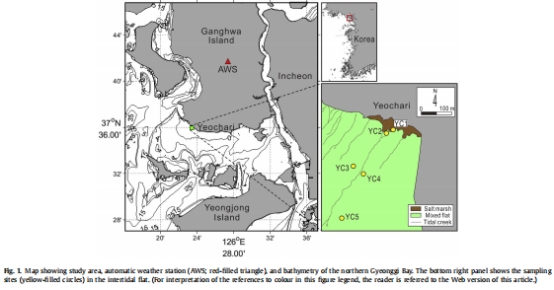 研究區(qū)域與采樣:選擇韓國(guó)慶州灣的鹽沼和混合平坦區(qū)作為研究點(diǎn)(圖1),在三種天氣條件(無(wú)雨、降雨、雨后)下采集表層沉積物樣本。