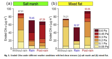 研究意義:直接量化降雨對(duì)沉積物和MPB可蝕性的影響。數(shù)據(jù)顯示降雨增加沉積物侵蝕但減少M(fèi)PB侵蝕,揭示降雨的物理擾動(dòng)和生物響應(yīng)差異。例如,圖4顯示降雨條件下侵蝕質(zhì)量增加37-86%,圖5顯示侵蝕Chl-a在降雨條件下減少。