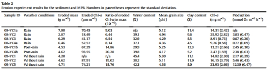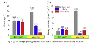 MPB可蝕性:降雨條件下,MPB可蝕性降低,總侵蝕Chl-a減少29%。在混合平坦區(qū),降雨顯著降低了MPB的生物活性(生物量和初級(jí)生產(chǎn)),表層Chl-a濃度雨后減少73%。在鹽沼區(qū),MPB生物活性穩(wěn)定,降雨影響較小,可能由于植被冠層保留了侵蝕的MPB。