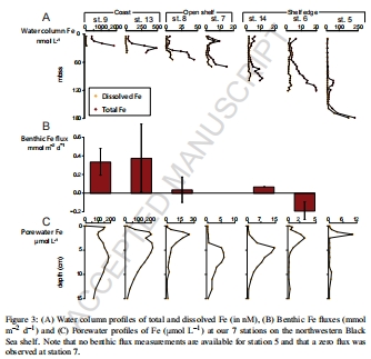 摘要指出,陸架沉積物是海洋中鐵的重要來源,影響浮游植物生長和碳循環。本研究通過黑海西北部陸架7個站點的綜合采樣(水深27-180 m),發現: