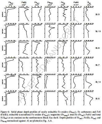 埋藏模式:表面沉積物Fe/Al比率在遠岸站點較高(1.2-2 wt% wt?1),但深層類似,表明橫向運輸的Fe埋藏有限。