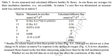 Benthic通量測量:使用Albex lander進行原位培養,測量benthic O2和Fe通量(表5)。