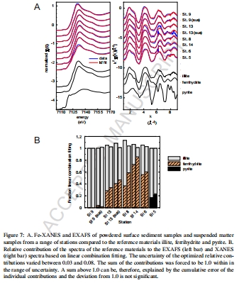 研究意義:表征Fe的礦物學和結合形態。沉積物富集易還原Fe氧化物(ferrihydrite)和粘土結合Fe(圖5、圖6)。X射線光譜證實遠岸站點ferrihydrite比例高(圖7),指示運輸過程中的氧化沉淀。Fe/Al比率變化(圖6)顯示沿海站點埋藏有限,遠岸站點富集。