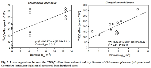 物種特異性刺激:C. insidiosum對硝化的促進效應是C. plumosus的15倍(斜率43.13 vs. 2.45 μmol g?1 h?1),源于其持續通風維持 burrow 氧化環境(Fig. 3)。
