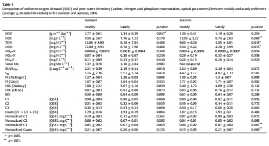 數據內容:SOD值范圍0.8–3.3 g m?2 d?1(夏季)和0.7–2.1 g m?2 d?1(秋季)。泥質沉積物夏季SOD更高(1.77 vs. 1.34 g m?2 d?1, p=0.047)。