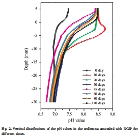 pH垂直分布:表層沉積物(-3 mm)pH最高達8.74(Day 10),高于對照(7.06),顯示NCSP溶解導致局部堿化(Fig. 2)。