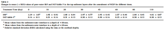 數據內容:孔隙水SRP平均濃度從2.29 mg/L(Day 0)增至4.02 mg/L(Day 110);垂直分布顯示表層SRP增加顯著。