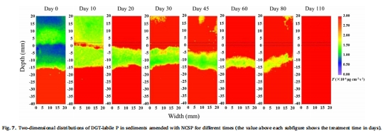 數據內容:DGT不穩定磷平均濃度從0.16 mg/L(Day 0)增至0.31 mg/L(Day 10);2D成像顯示高通量區從覆蓋層擴展至全剖面(Day 110)。