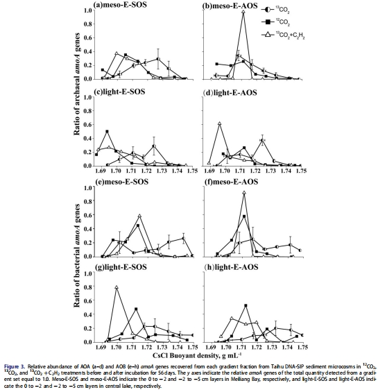 數據內容:13C標記的amoA基因在CsCl梯度“重”分數中富集,表明自養活性;AOA在中等富營養化缺氧層標記較少,AOB在輕度富營養化低氧層標記較少。