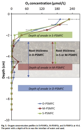 D-PSMFC:陽(yáng)極區(qū)域氧氣濃度極低(0.23–0.77 μmol/L),但根系下方(-5.0至-7.0 cm)存在氧氣釋放層(最高10.8 μmol/L)。