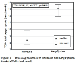 數據:Hornsund 的TOU為 8.11 ± 0.87 mmol m?2 d?1,Kongsfjorden 為 12.86 ± 0.69 mmol m?2 d?1,差異顯著(p=0.0039)。