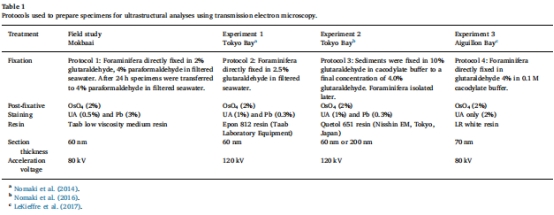 樣品處理與觀察:將野外和實驗室獲得的活體有孔蟲固定、脫水、包埋并制成超薄切片,使用透射電子顯微鏡(TEM)進行觀察和拍照(方法細節見表1和表2)。