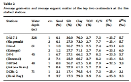 數據:包括沉積物粒度組成(砂、粉砂、粘土百分比)、總有機碳(TOC)、總氮(TN)、C/N比和有機質穩定同位素(δ13C, δ15N)。