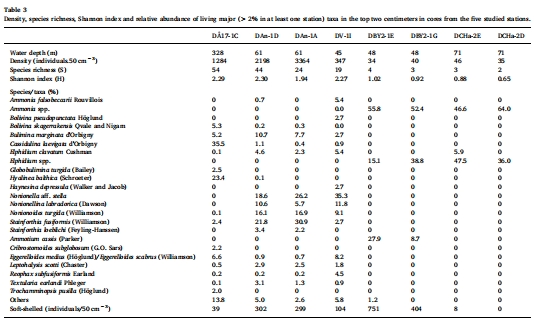 數據:活體有孔蟲密度(ind./50 cm3)、物種豐富度(S)、香農多樣性指數(H')、主要物種的相對豐度(%),以及通過顯微鏡觀察到的殼體溶解現象。