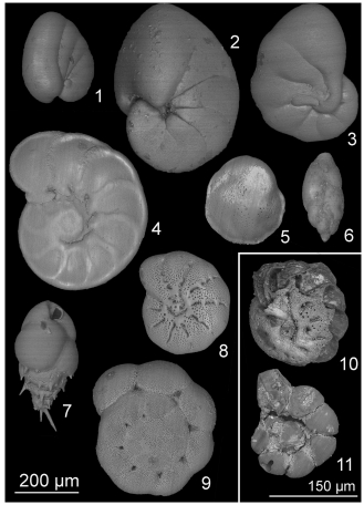 研究發現,有孔蟲的密度和物種豐富度在斯卡格拉克站點最高,那里的整體生活條件相對有利,具有較高的水體鹽度和Ωcalc,以及較高的底層水和孔隙水pH值與氧濃度。各站點最常見的物種反映了環境條件的差異。主導物種在斯卡格拉克為Cassidulina laevigata和 Hyalinea balthica,在卡特加特海峽(Kattegat)為 Stainforthia fusiformis、Nonionella aff. stella和 Nonionoides turgida,在厄勒海峽(?resund)為 N. aff. stella和 Nonionellina labradorica。最不利的條件,如低鹽度、低Ωcalc、低溶解氧濃度和低pH值,出現在波羅的海站點,那里占主導地位的活體 taxa Ammoniaspp. 和 Elphidiumspp. 的鈣質殼出現部分至完全溶解,這可能是由于影響生物礦化所需能量的多種壓力源共同作用所致。