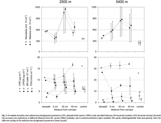 研究意義:數(shù)據(jù)顯示,在兩個(gè)水深,食物沉降點(diǎn)附近的線蟲(chóng)密度均普遍高于對(duì)照點(diǎn),且在20厘米距離處往往達(dá)到峰值。這直接支持了第二個(gè)假設(shè),表明有機(jī)質(zhì)輸入刺激了線蟲(chóng)種群的繁殖或聚集。