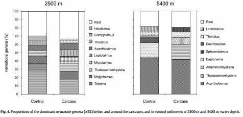 水深是關(guān)鍵影響因素:食物沉降的降解速度和其對(duì)線蟲(chóng)群落的影響強(qiáng)度因水深而異。在2500米處,清道夫(如大型端足類(lèi))更活躍,尸體降解更快,對(duì)線蟲(chóng)群落的影響(如多樣性增加、功能群轉(zhuǎn)變)更為明顯。而在5400米處,降解較慢,影響相對(duì)較弱。