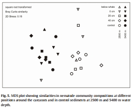 研究意義:非度量多維標(biāo)度分析(NMDS,圖5)顯示,兩個(gè)水深的線蟲(chóng)群落存在顯著差異。在2500米處,食物沉降點(diǎn)的線蟲(chóng)多樣性(屬數(shù))高于對(duì)照點(diǎn);而在5400米處,差異不顯著。這表明食物沉降的影響因水深而異,較淺水深的群落響應(yīng)更劇烈。