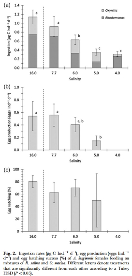 數(shù)據(jù):測(cè)量了雌性橈足類在不同鹽度下的碳攝入量、每日產(chǎn)卵數(shù)及卵的孵化成功率。