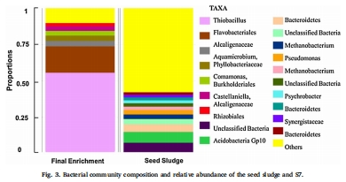 數據:Illumina測序顯示,初始污泥Shannon指數為4.89,最終富集物(S7)降至0.49;Thiobacillus相對豐度達55%,其他屬如Flavobacteriales、Alcaligenaceae等存在。