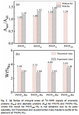數據:FTIR顯示P4VP-Ru在1650 cm?1出現羧酸酯特征峰(bda引入);UV-vis顯示P4VP-Ru在350-400 nm和450-550 nm新增吸收帶(Ru(II)特征);NMR顯示芳香/脂肪質子比(Aaro/Aali)增加;ICP-MS測得Ru負載量~2.8-3.5 wt%。