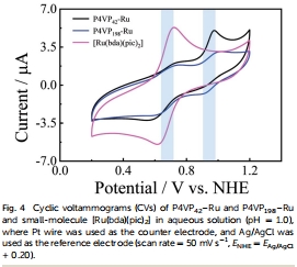 數據:CV曲線顯示Ru(III)/Ru(II)偶極~0.70 V,Ru(IV)/Ru(III)偶極~1.0 V;P4VP-Ru與均相[Ru(bda)(pic)?]對比,電位輕微偏移。