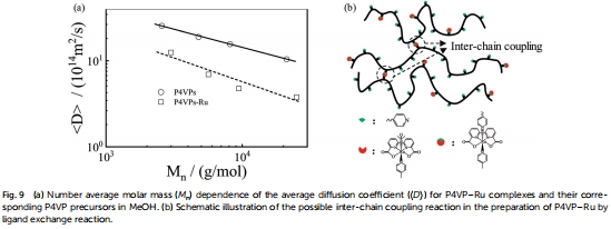 數據:DLS顯示P4VP-Ru擴散系數〈D〉比P4VP前驅體低~0.3-0.5倍,且隨鏈長增加而減??;〈D〉與Mn呈冪律關系(指數~0.5)。