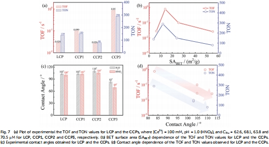 數(shù)據(jù):Fig. 6b-e顯示氧氣產(chǎn)生隨時(shí)間變化,F(xiàn)ig. 6f初始速率v_i與Ru濃度呈準(zhǔn)一級(jí)關(guān)系(指數(shù)α~1);Fig. 7a TOF/TON值CCP3最佳(TOF~0.85 s?1),F(xiàn)ig. 7c-d接觸角越?。ㄓH水性越強(qiáng)),活性越高。