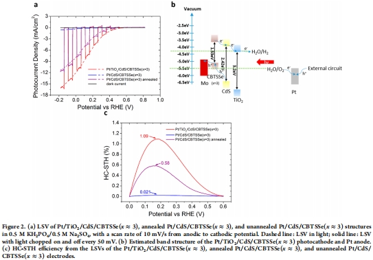 高性能光陰極:Pt/TiO?/CdS/CBTSSe(x≈3)光陰極實現12.08 mA/cm2光電流(0 V/RHE)和1.09% HC-STH效率,為CBTSSe基器件最高值。