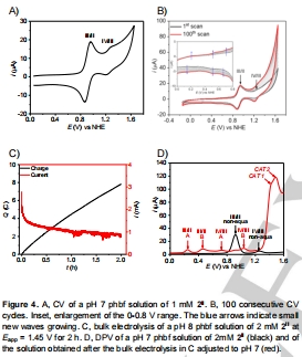 電化學分析:通過CV、DPV(Fig. 3, 4)和庫侖法測量氧化還原電位、pH依賴性(Pourbaix圖,Fig. 5)和催化電流。