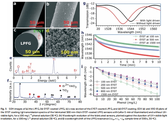 PLPFG:薄化LPFG(直徑65 μm)增強倏逝場;涂層EYST(Er3?:YAlO?/SiO?/TiO?)實現紫外-可見光驅動光催化(Fig. 1a)。