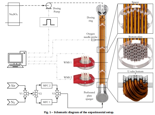 研究探討了在直徑100 mm、清液高度1100 mm的氣泡柱中,密集垂直管束(包括三角形和方形排列、管徑8 mm和13 mm、平底和U型管底部設計)對液體分散和氣體-液體傳質的影響。通過導電示蹤劑實驗(使用線網格傳感器WMS)和快速響應氧探針(如Unisense OX 100)測量液體分散系數和傳質系數。結果表明,管間距和排列是影響液體分散的關鍵參數,U型管底部設計能增強液體循環和分散;內部構件因湍流阻尼作用降低傳質系數(kLa),但優化設計(如小管徑三角形排列)能平衡性能。2D分散模型能可靠預測液體分散行為。