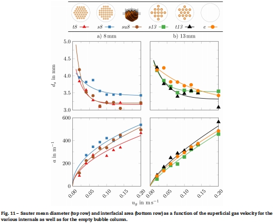 數據:Sauter直徑(ds)隨氣速增加而減小(如空柱ds從4 mm降至2 mm);界面面積(a)在小管徑配置最高(如s8的a≈200 m2/m3 at ug=0.05 m/s)。