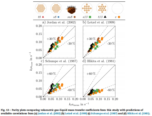 數據:現有關聯式(如Ohki-Inoue對Dz,l)對空柱預測良好,但低估內部構件影響;Letzel關聯式(kLa=0.5εg)與數據吻合較好。