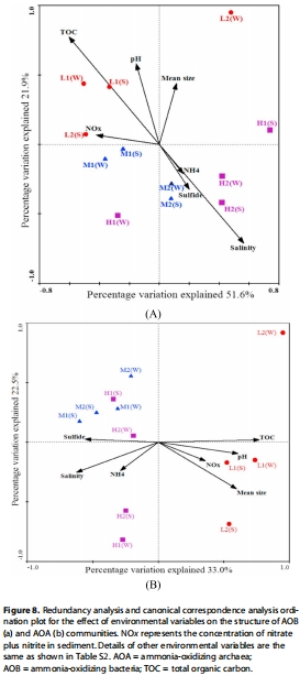 數據:RDA/CCA分析顯示鹽度和TOC顯著影響AOB/AOA群落結構(P<0.05),硝化速率與TOC正相關(R=0.686, P=0.015)。
