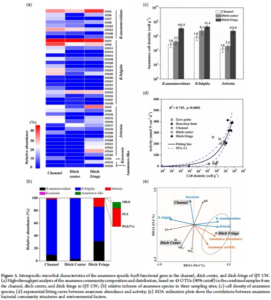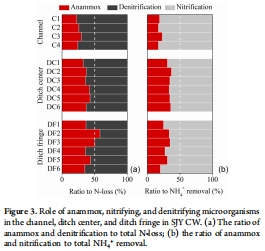數(shù)據(jù):在溝渠邊緣,anammox貢獻(xiàn)43.0%氮損失和44.4%銨去除;亞硝酸鹽來源中,銨氧化占55.8%,硝酸鹽還原占44.2%。