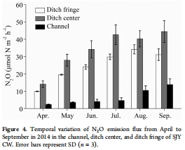 數(shù)據(jù):溝渠邊緣N2O通量(24.7 μmol/m2/h)低于溝渠中心(33.9 μmol/m2/h),熱點區(qū)域N2O排放減少27.1%。