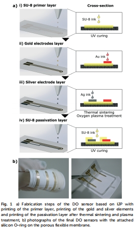傳感器制造:使用IJP在多孔PTFE膜上打印SU-8 primer層(密封孔隙),然后打印金(工作電極和計數電極)和銀(偽參考電極)墨水,形成電化學DO傳感器(Fig. 1)。打印后熱燒結(130°C,40分鐘)和UV固化,確保電極導電性和穩定性。