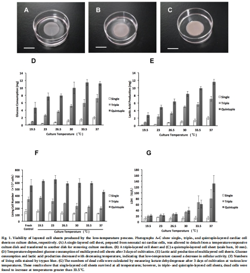 數(shù)據(jù):?jiǎn)螌蛹?xì)胞片在所有溫度下均存活,但三層和五層細(xì)胞片在33.5°C以上死亡細(xì)胞增加(Fig. 1F-G);葡萄糖消耗和乳酸產(chǎn)生隨溫度降低而減少(Fig. 1D-E),例如30°C時(shí)葡萄糖消耗比37°C低約40%。