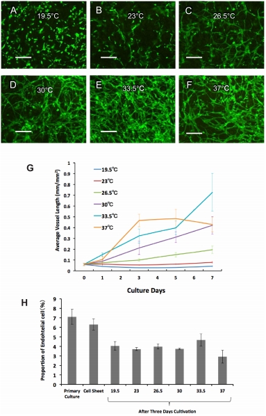 數(shù)據(jù):GFP標(biāo)記內(nèi)皮細(xì)胞顯示,33.5°C時(shí)血管網(wǎng)絡(luò)長(zhǎng)度最大(Fig. 3A-G);37°C培養(yǎng)5天后網(wǎng)絡(luò)停滯,而33.5°C持續(xù)發(fā)展至7天(Fig. 3G)。
